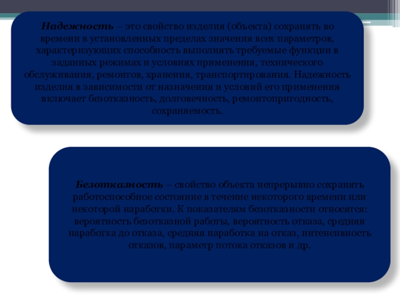 Безотказность – свойство объекта непрерывно сохранять работоспособное состояние в течение некоторого времени или некоторой наработки. К показателям безотказности относятся: вероятность безотказной работы, вероятность отказа, средняя наработка до отказа, средняя наработка на отказ, интенсивность отказов, параметр потока отказов и др.