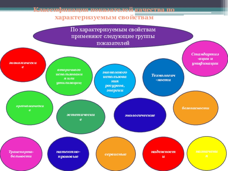 Качество продукции не ограничивается только одним свойством, это совокупность свойств. Свойства продукции количественно выражаются в показателях качества. Общепризнанна классификация на десять групп свойств и соответственно показателей.