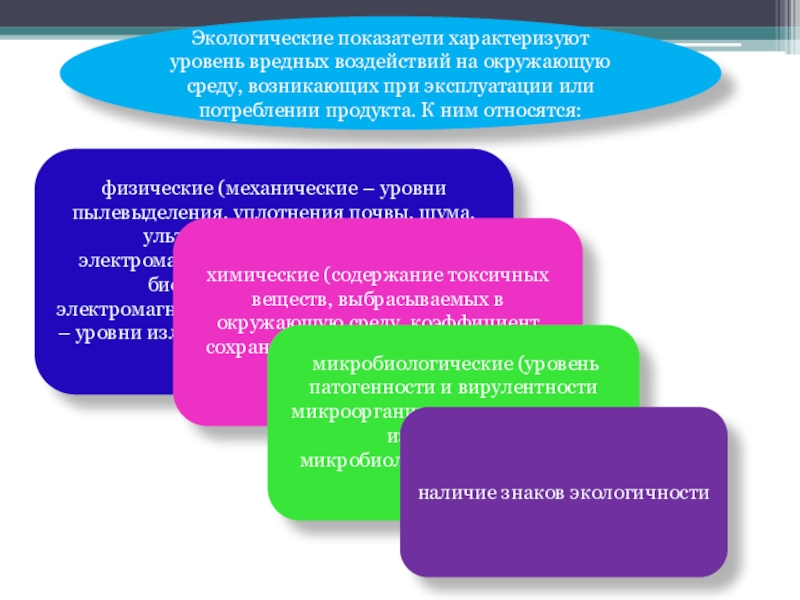 химические (содержание токсичных веществ, выбрасываемых в окружающую среду, коэффициент сохраняемости токсичных веществ и др.)