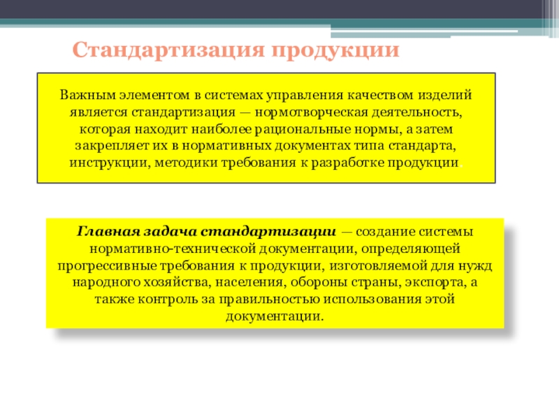 Главная задача стандартизации — создание системы нормативно-технической документации, определяющей прогрессивные требования к продукции, изготовляемой для нужд народного хозяйства, населения, обороны страны, экспорта, а также контроль за правильностью использования этой документации.