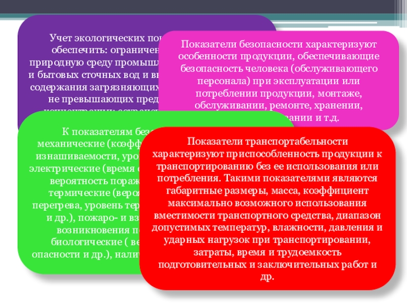 Показатели безопасности характеризуют особенности продукции, обеспечивающие безопасность человека (обслуживающего персонала) при эксплуатации или потреблении продукции, монтаже, обслуживании, ремонте, хранении, транспортировании и т.д.