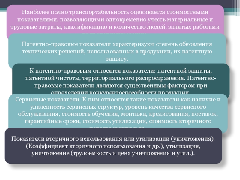 Показатели транспортабельности характеризуют приспособленность продукции к транспортированию без ее использования или потребления. Такими показателями являются габаритные размеры, масса, коэффициент максимально возможного использования вместимости транспортного средства, диапазон допустимых температур, влажности, давления и ударных нагрузок при транспортировании, затраты, время и трудоемкость подготовительных и заключительных работ и др.
