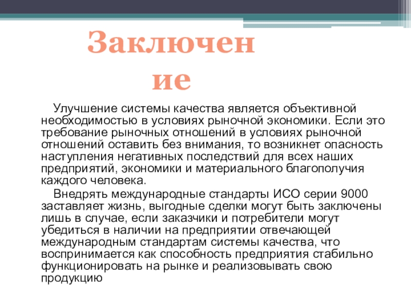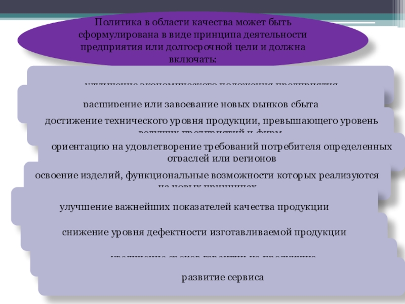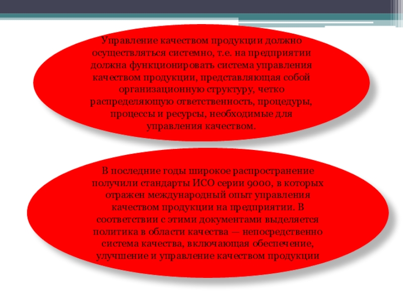 В последние годы широкое распространение получили стандарты ИСО серии 9000, в которых отражен международный опыт управления качеством продукции на предприятии. В соответствии с этими документами выделяется политика в области качества — непосредственно система качества, включающая обеспечение, улучшение и управление качеством продукции