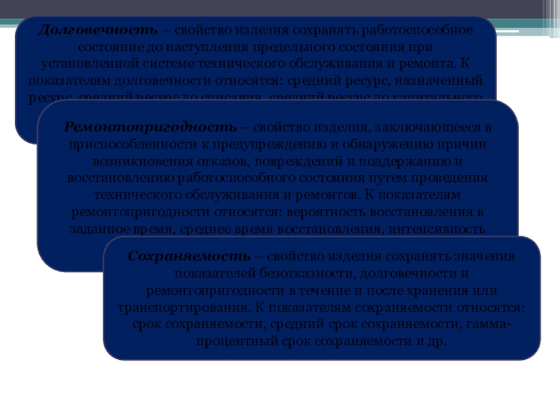 Сохраняемость – свойство изделия сохранять значения показателей безотказности, долговечности и ремонтопригодности в течение и после хранения или транспортирования. К показателям сохраняемости относятся: срок сохраняемости, средний срок сохраняемости, гамма-процентный срок сохраняемости и др.