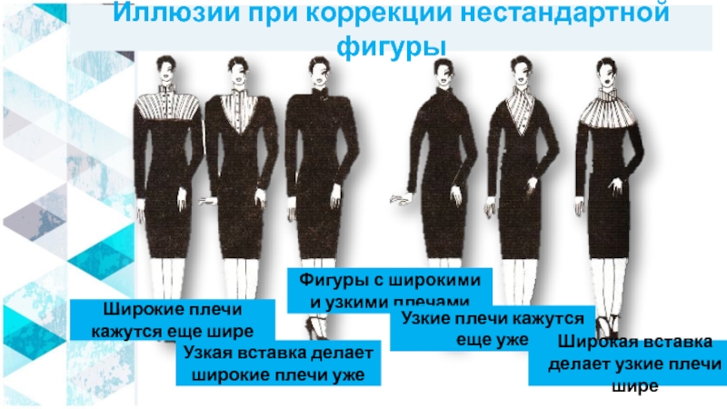 Не стоит останавливать свой выбор на облегающей и узкой одежде. Слишком широкая одежда в форме шатра — тоже не лучший выбор. Избегайте вертикальных деталей, отделок, полос, длинных вырезов.