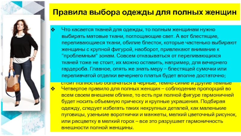 Что касается тканей для одежды, то полным женщинам нужно выбирать матовые ткани, поглощающие свет. А вот блестящие, переливающиеся ткани, обилие блесток, которые частенько выбирают женщины с крупной фигурой, наоборот, привлекают внимание к "проблемным" зонам. Совсем отказываться от переливающихся тканей тоже не стоит, их можно оставить, например, для вечернего гардероба. Главное, опять же знать меру – блестящей сумочки или переливчатой отделки вечернего платья будет вполне достаточно;