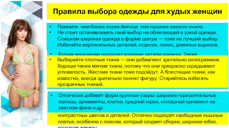 Худым женщинам подходят крупные детали одежды. Также необходимо зрительно разделять фигуру горизонтальными линиями, тем самым расширяя ее (горизонтальные швы, пуговицы, лацканы, карманы). Вообще чем больше в одежде деталей, тем лучше. Объема одежде придадут пышные складки, рюши, воланы, оборки. Следует избегать вертикальных полос.