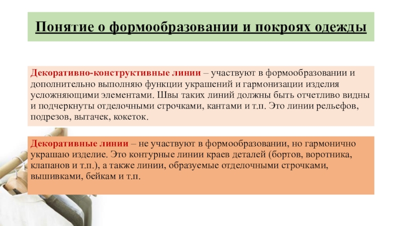 Декоративные линии – не участвуют в формообразовании, но гармонично украшаю изделие. Это контурные линии краев деталей (бортов, воротника, клапанов и т.п.), а также линии, образуемые отделочными строчками, вышивками, бейкам и т.п.