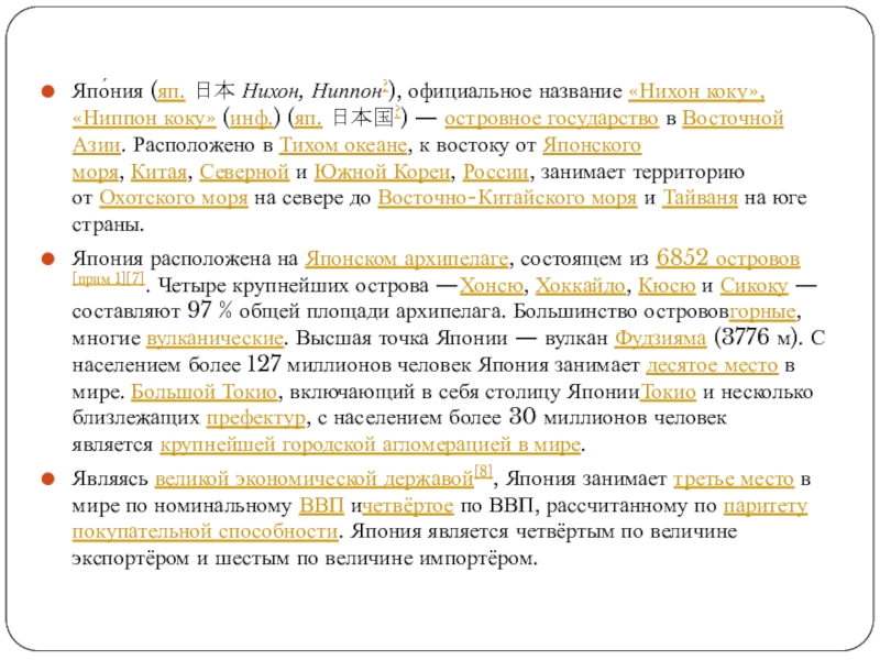 Слайд 3Япо́ния (яп. 日本 Нихон, Ниппон?), официальное название «Нихон коку», «Ниппон коку» (инф.) (яп. 日本国?) — островное государство в Восточной Азии. Расположено в Тихом