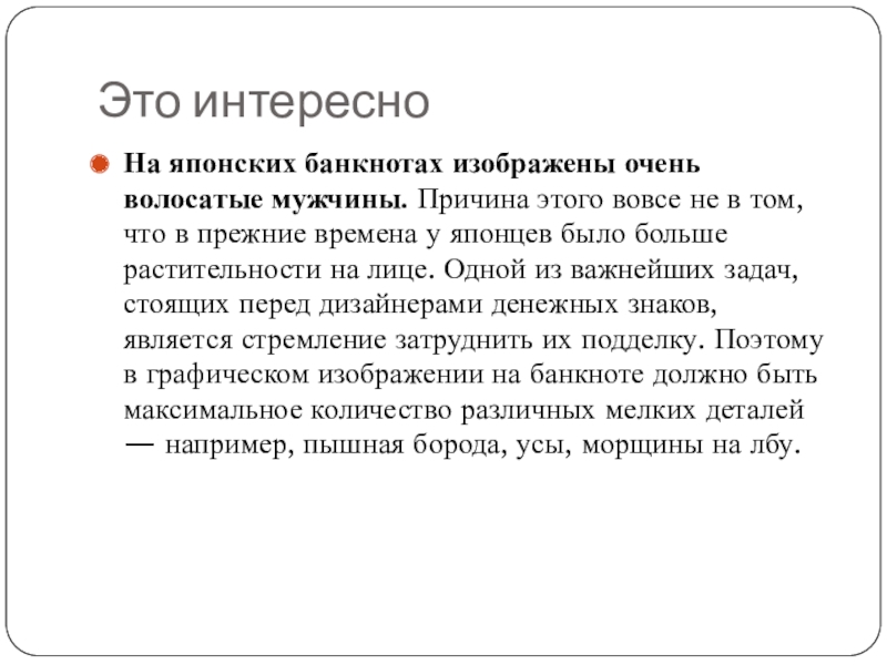 в том, что в прежние времена у японцев было больше растительности на лице. Одной из важнейших задач, стоящих перед дизайнерами денежных знаков, является стремление затруднить их подделку. Поэтому в графическом изображении на банкноте должно быть максимальное количество различных мелких деталей — например, пышная борода, усы, морщины на лбу.