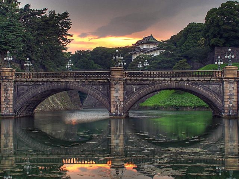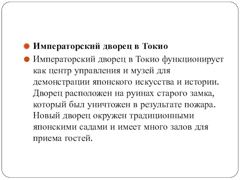 и музей для демонстрации японского искусства и истории. Дворец расположен на руинах старого замка, который был уничтожен в результате пожара. Новый дворец окружен традиционными японскими садами и имеет много залов для приема гостей.