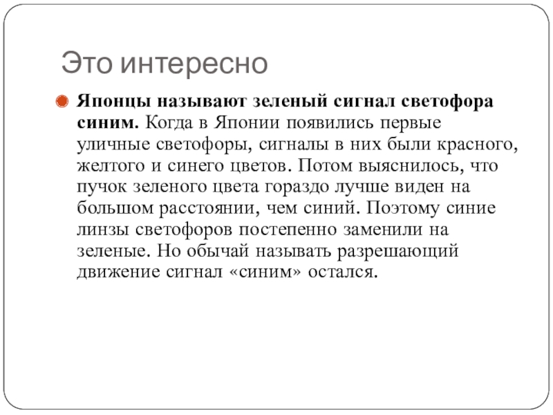 Японцы называют зеленый сигнал светофора синим. Когда в Японии появились первые