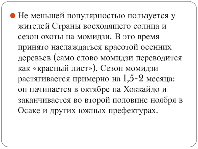 охоты на момидзи. В это время принято наслаждаться красотой осенних деревьев (само слово момидзи переводится как «красный лист»). Сезон момидзи растягивается примерно на 1,5-2 месяца: он начинается в октябре на Хоккайдо и заканчивается во второй половине ноября в Осаке и других южных префектурах.