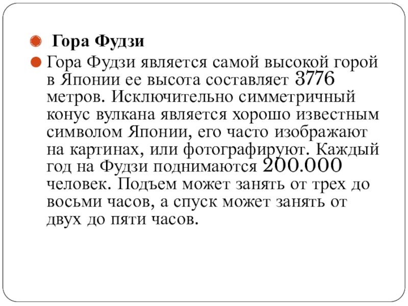 высота составляет 3776 метров. Исключительно симметричный конус вулкана является хорошо известным символом Японии, его часто изображают на картинах, или фотографируют. Каждый год на Фудзи поднимаются 200.000 человек. Подъем может занять от трех до восьми часов, а спуск может занять от двух до пяти часов.