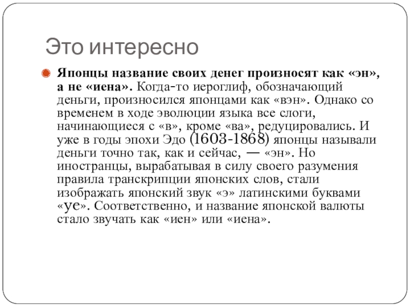 иероглиф, обозначающий деньги, произносился японцами как «вэн». Однако со временем в ходе эволюции языка все слоги, начинающиеся с «в», кроме «ва», редуцировались. И уже в годы эпохи Эдо (1603-1868) японцы называли деньги точно так, как и сейчас, — «эн». Но иностранцы, вырабатывая в силу своего разумения правила транскрипции японских слов, стали изображать японский звук «э» латинскими буквами «ye». Соответственно, и название японской валюты стало звучать как «иен» или «иена».