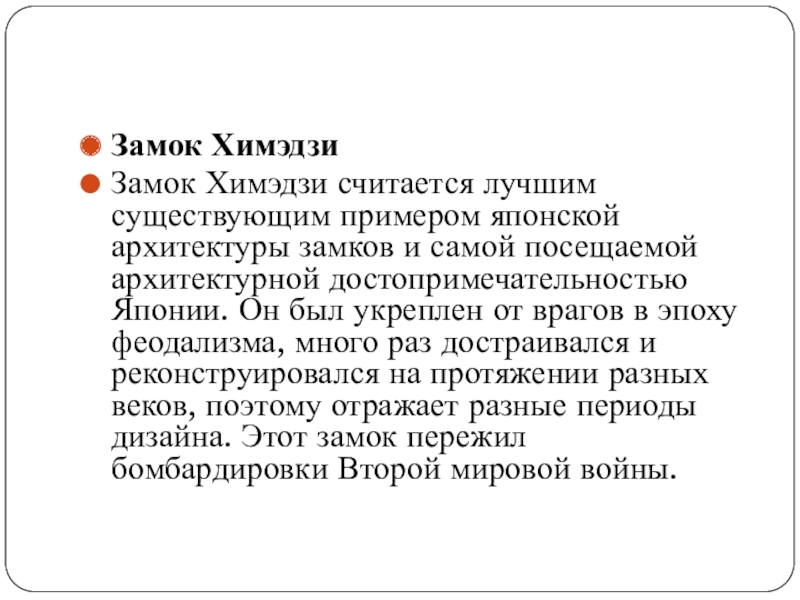 самой посещаемой архитектурной достопримечательностью Японии. Он был укреплен от врагов в эпоху феодализма, много раз достраивался и реконструировался на протяжении разных веков, поэтому отражает разные периоды дизайна. Этот замок пережил бомбардировки Второй мировой войны.