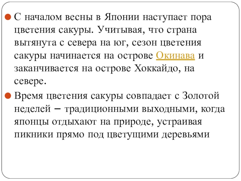 страна вытянута с севера на юг, сезон цветения сакуры начинается на острове Окинава и заканчивается на острове Хоккайдо, на севере.