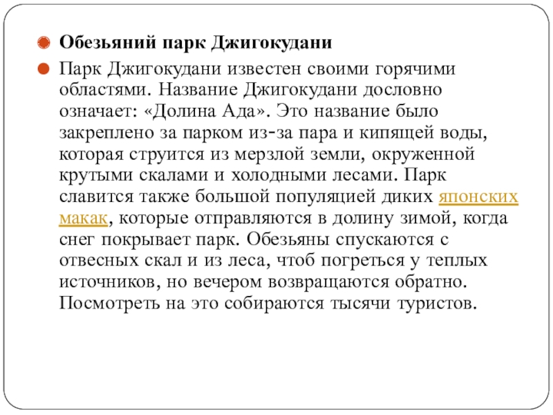 Парк Джигокудани известен своими горячими областями. Название Джигокудани дословно