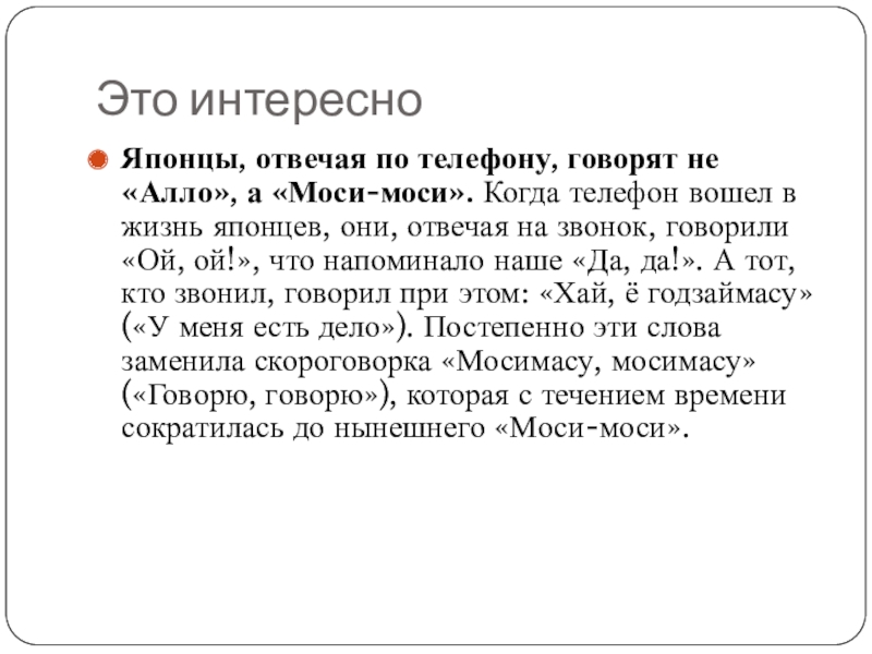 вошел в жизнь японцев, они, отвечая на звонок, говорили «Ой, ой!», что напоминало наше «Да, да!». А тот, кто звонил, говорил при этом: «Хай, ё годзаймасу» («У меня есть дело»). Постепенно эти слова заменила скороговорка «Мосимасу, мосимасу» («Говорю, говорю»), которая с течением времени сократилась до нынешнего «Моси-моси».