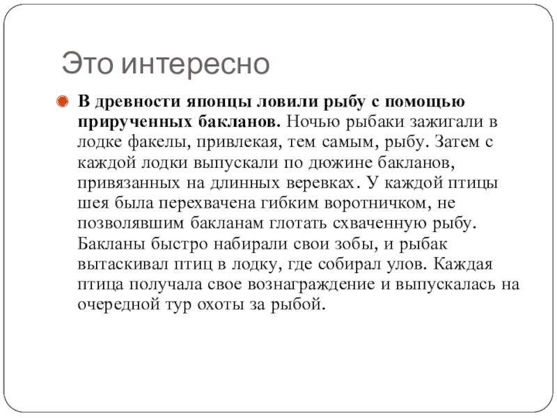 В древности японцы ловили рыбу с помощью прирученных бакланов. Ночью рыбаки