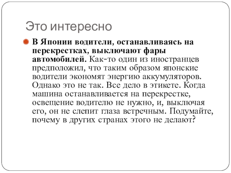 из иностранцев предположил, что таким образом японские водители экономят энергию аккумуляторов. Однако это не так. Все дело в этикете. Когда машина останавливается на перекрестке, освещение водителю не нужно, и, выключая его, он не слепит глаза встречным. Подумайте, почему в других странах этого не делают?