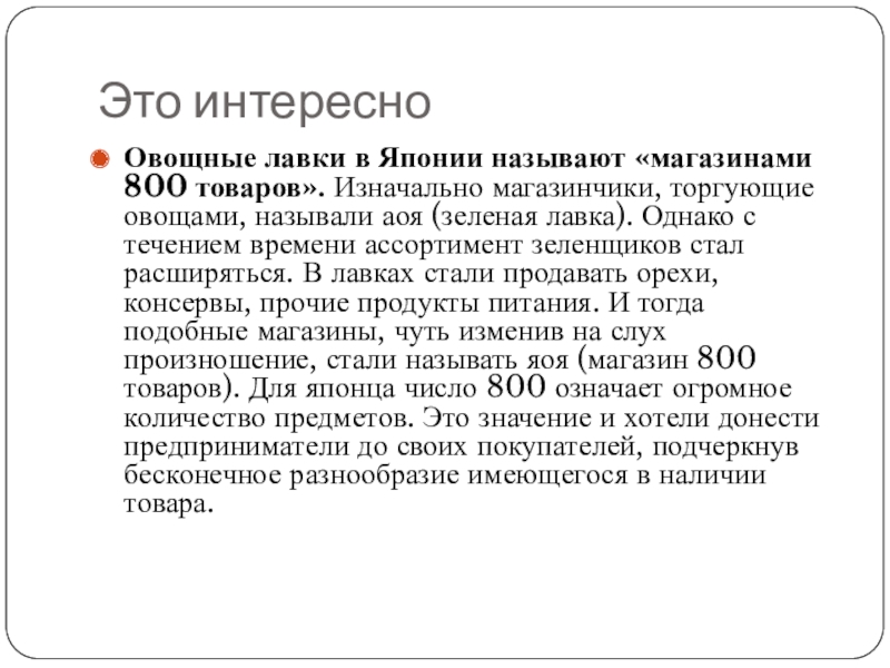Овощные лавки в Японии называют «магазинами 800 товаров». Изначально магазинчики, торгующие