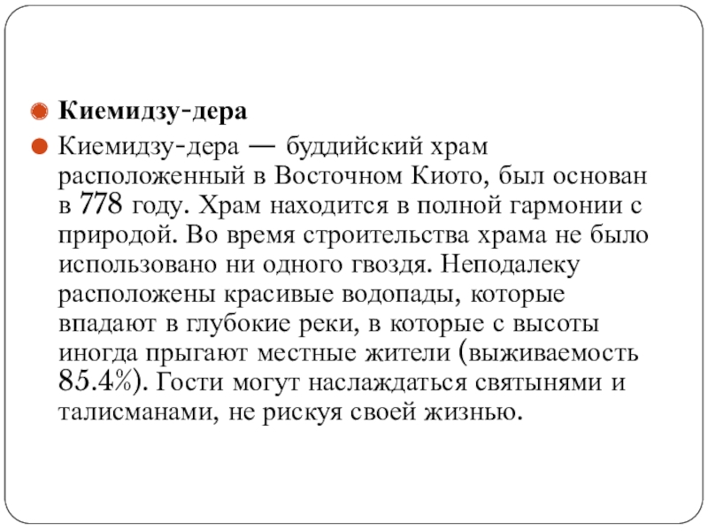 778 году. Храм находится в полной гармонии с природой. Во время строительства храма не было использовано ни одного гвоздя. Неподалеку расположены красивые водопады, которые впадают в глубокие реки, в которые с высоты иногда прыгают местные жители (выживаемость 85.4%). Гости могут наслаждаться святынями и талисманами, не рискуя своей жизнью.