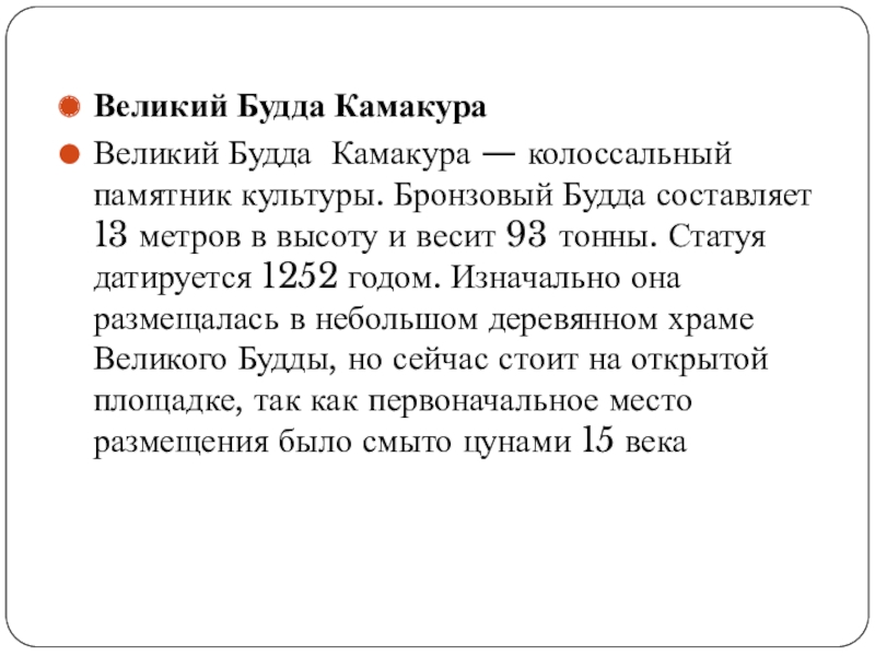 составляет 13 метров в высоту и весит 93 тонны. Статуя датируется 1252 годом. Изначально она размещалась в небольшом деревянном храме Великого Будды, но сейчас стоит на открытой площадке, так как первоначальное место размещения было смыто цунами 15 века
