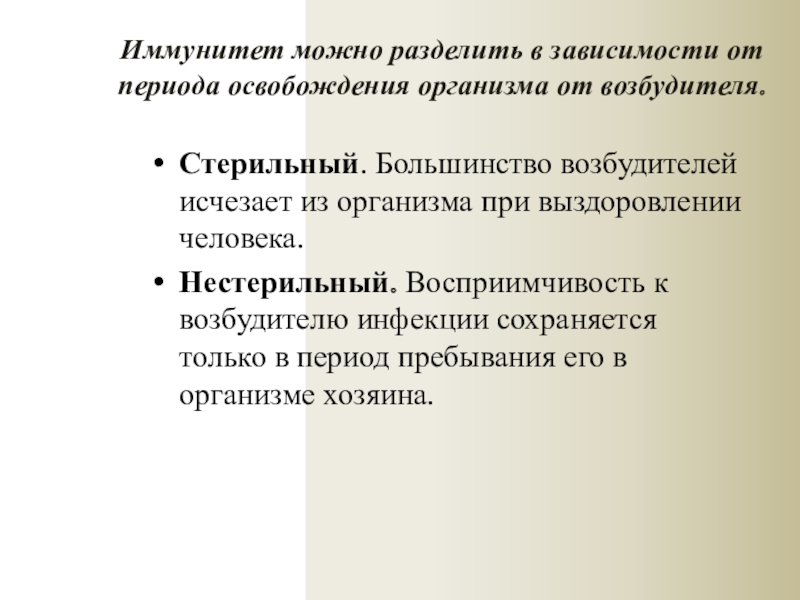 Слайд 10Иммунитет можно разделить в зависимости от периода освобождения организма от возбудителя.