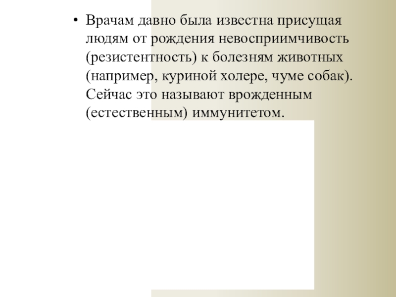 Слайд 4Врачам давно была известна присущая людям от рождения невосприимчивость (резистентность) к