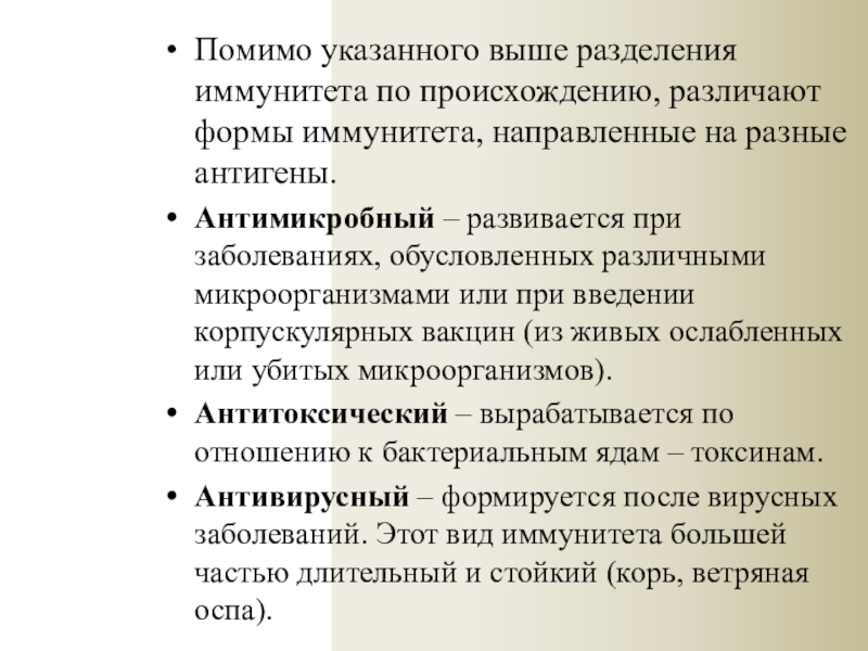 Помимо указанного выше разделения иммунитета по происхождению, различают формы иммунитета, направленные на разные антигены. Антимикробный – развивается