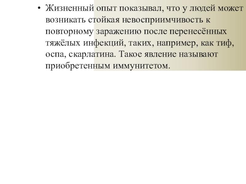 Жизненный опыт показывал, что у людей может возникать стойкая невосприимчивость к повторному заражению после перенесённых тяжёлых инфекций,