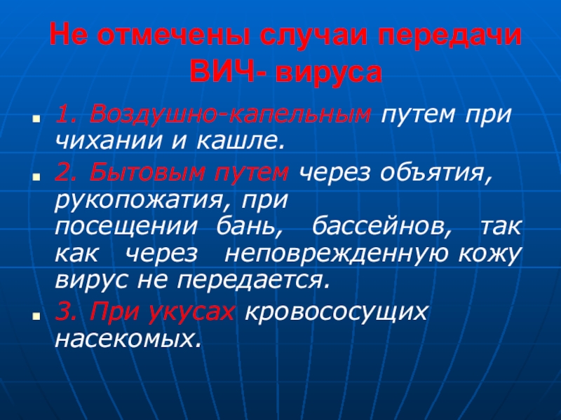 Слайд 20Не отмечены случаи передачи ВИЧ- вируса