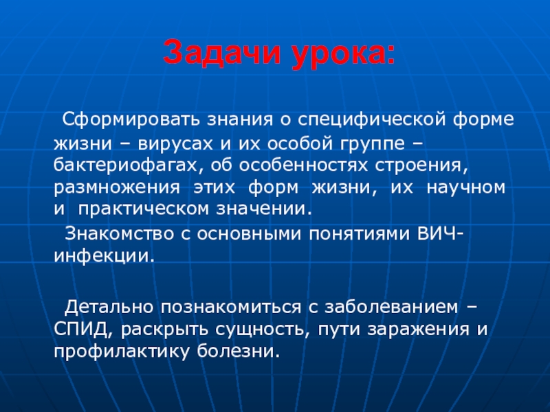 Детально познакомиться с заболеванием – СПИД, раскрыть сущность, пути заражения и профилактику болезни.