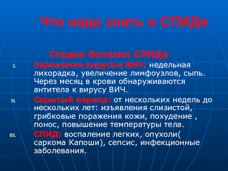 Скрытый период: от нескольких недель до нескольких лет: изъявления слизистой, грибковые поражения кожи, похудение ,понос, повышение температуры тела.