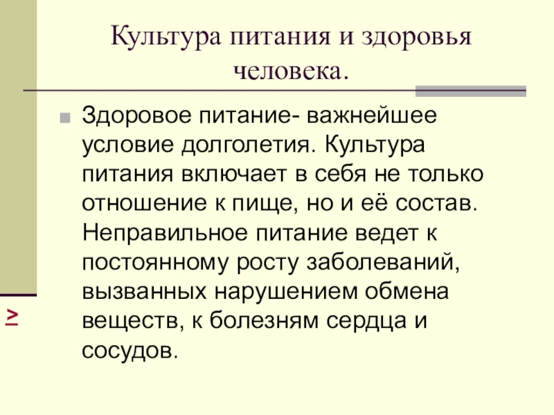 включает в себя не только отношение к пище, но и её состав. Неправильное питание ведет к постоянному росту заболеваний, вызванных нарушением обмена веществ, к болезням сердца и сосудов.