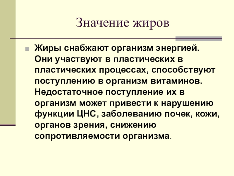 Жиры снабжают организм энергией. Они участвуют в пластических в пластических