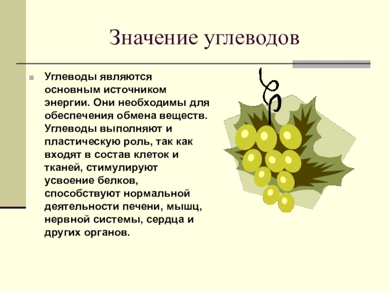 веществ. Углеводы выполняют и пластическую роль, так как входят в состав клеток и тканей, стимулируют усвоение белков, способствуют нормальной деятельности печени, мышц, нервной системы, сердца и других органов.