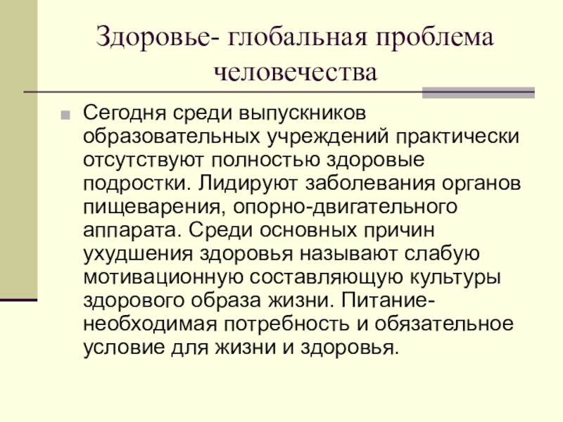 здоровые подростки. Лидируют заболевания органов пищеварения, опорно-двигательного аппарата. Среди основных причин ухудшения здоровья называют слабую мотивационную составляющую культуры здорового образа жизни. Питание- необходимая потребность и обязательное условие для жизни и здоровья.