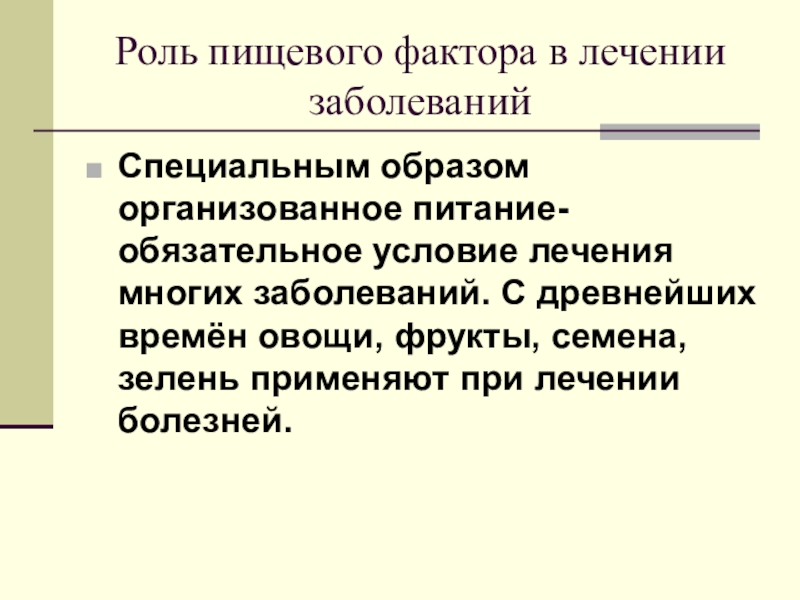 Слайд 14Роль пищевого фактора в лечении заболеваний