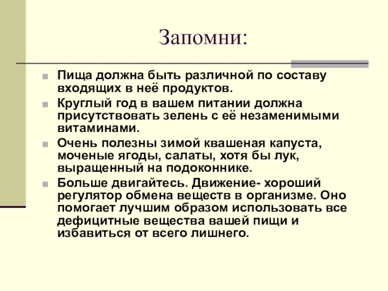Очень полезны зимой квашеная капуста, моченые ягоды, салаты, хотя бы лук, выращенный на подоконнике.