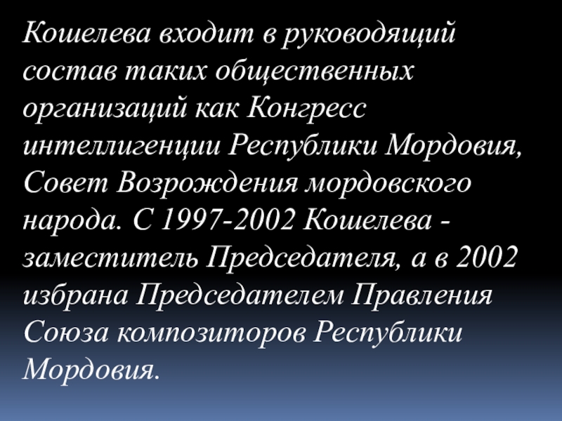 Республики Мордовия, Совет Возрождения мордовского народа. С 1997-2002 Кошелева - заместитель Председателя, а в 2002 избрана Председателем Правления Союза композиторов Республики Мордовия.