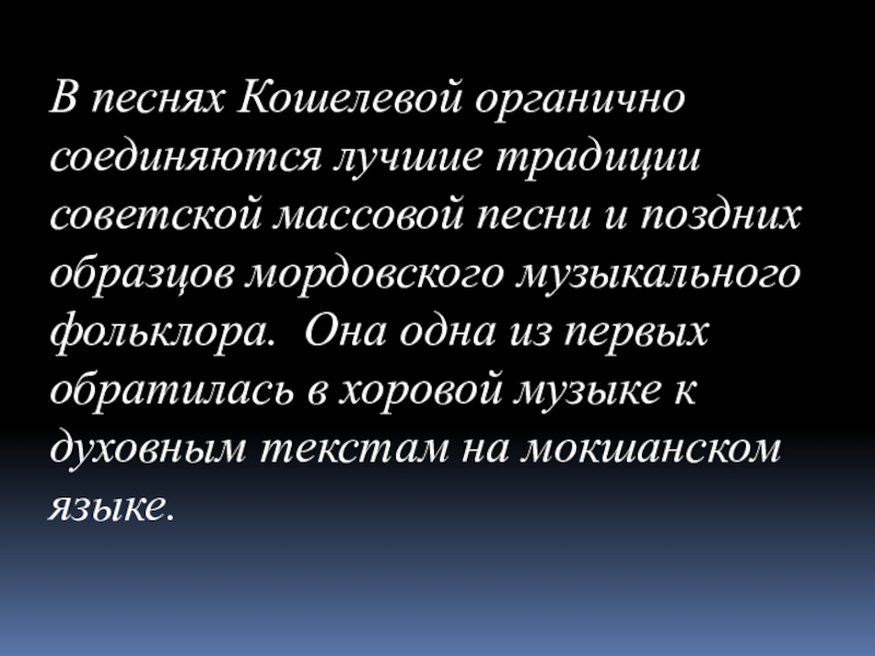 поздних образцов мордовского музыкального фольклора. Она одна из первых обратилась в хоровой музыке к духовным текстам на мокшанском языке.