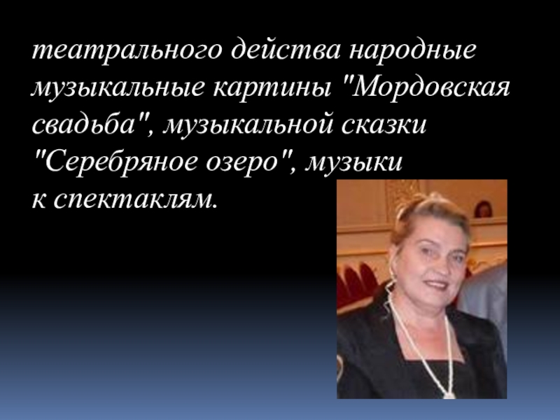Слайд 15театрального действа народные музыкальные картины "Мордовская свадьба", музыкальной сказки "Серебряное озеро",