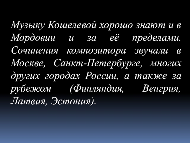 Слайд 9Музыку Кошелевой хорошо знают и в Мордовии и за её пределами.