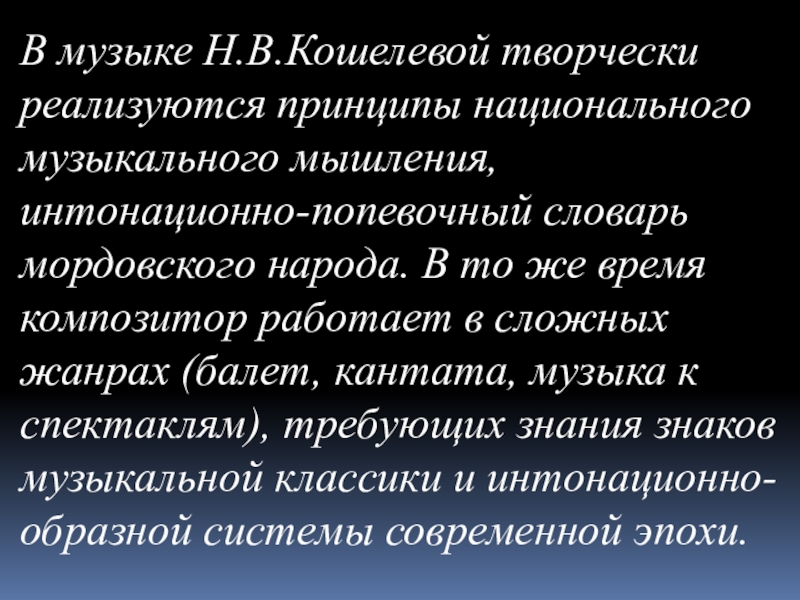 Слайд 13В музыке Н.В.Кошелевой творчески реализуются принципы национального музыкального мышления, интонационно-попевочный словарь