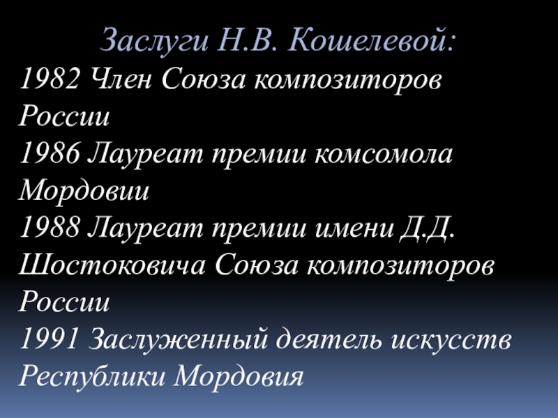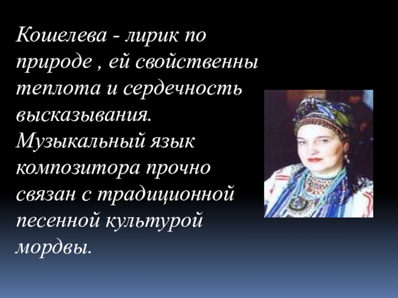 Слайд 2Кошелева - один из самых любимых и популярных в Мордовии композиторов.