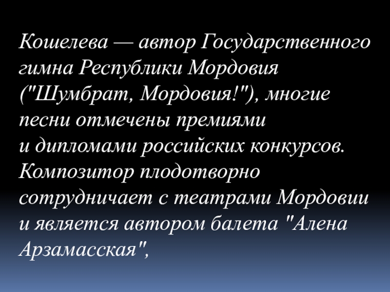 Слайд 14Кошелева — автор Государственного гимна Республики Мордовия ("Шумбрат, Мордовия!"), многие песни отмечены