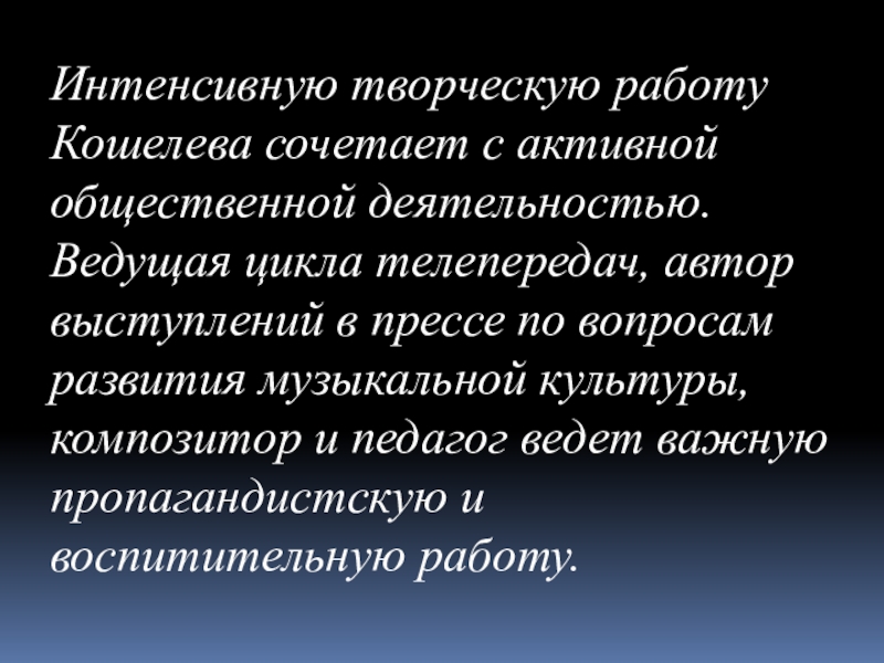 Слайд 11Интенсивную творческую работу Кошелева сочетает с активной общественной деятельностью. Ведущая цикла