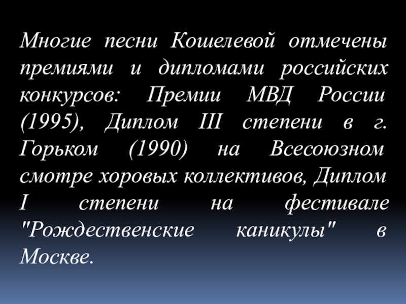 Слайд 8Многие песни Кошелевой отмечены премиями и дипломами российских конкурсов: Премии МВД